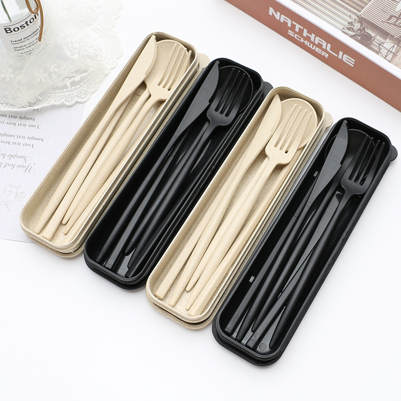 Travel Portable Knife Spoon Fork Chopsticks Wheat Straw Fiber Flatware Beige Black Wheat Cutlery Set