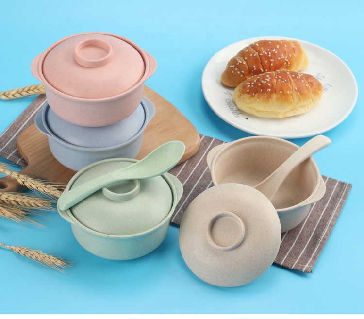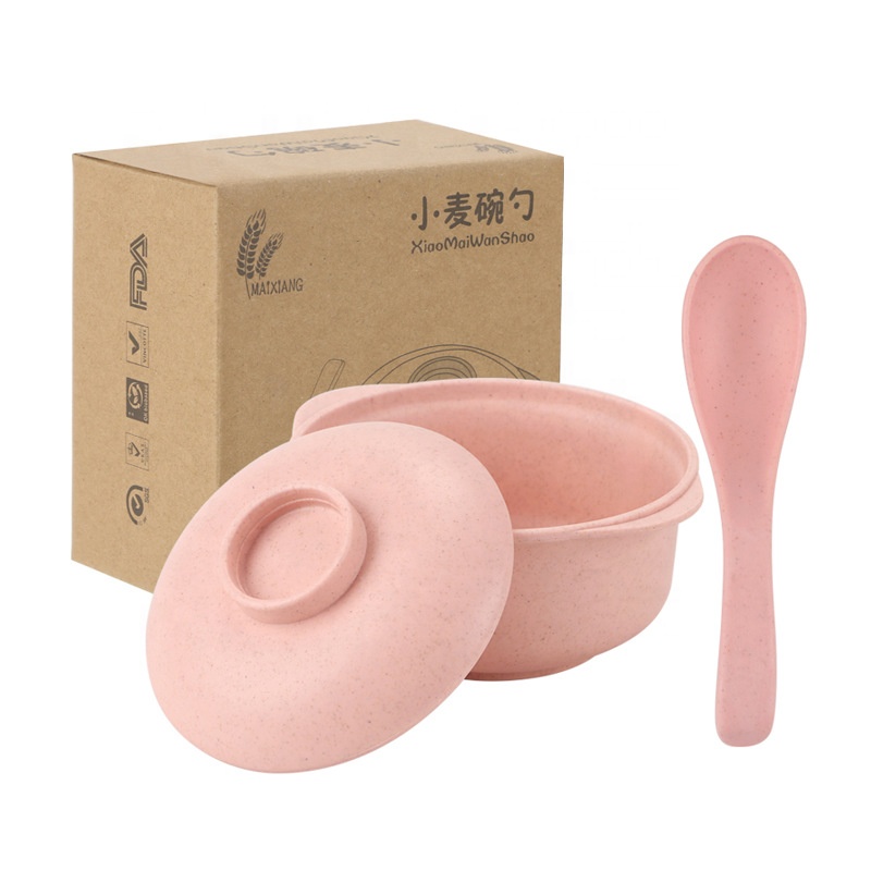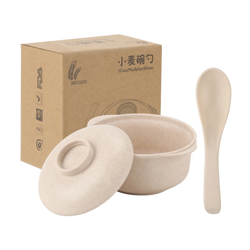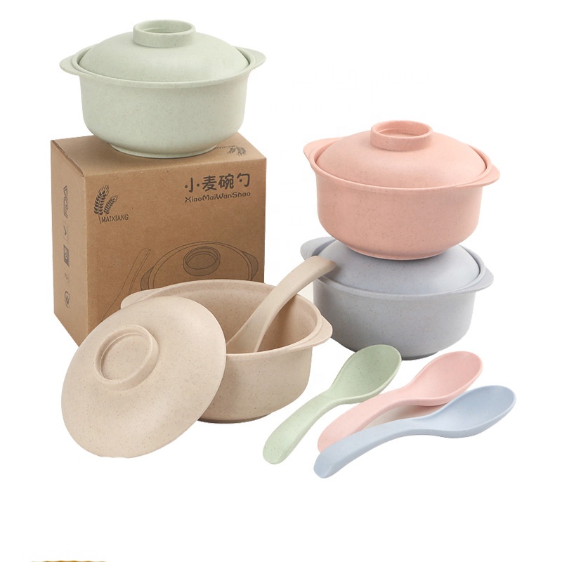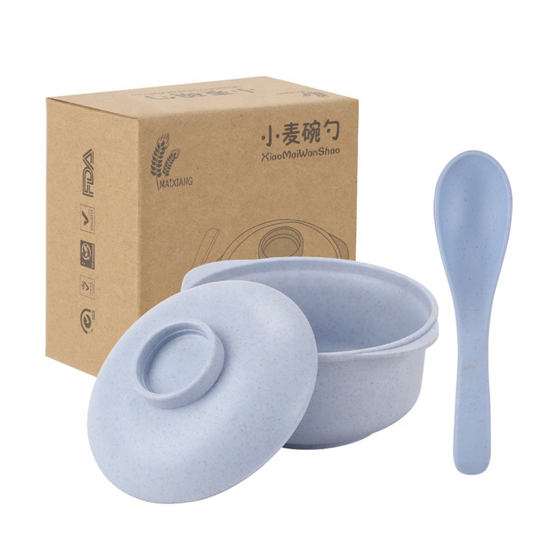 Wheat Straw Bowl Color Reusable Degradable Tableware Set Covered Casserole Bowl and Spoon with Box Cutlery Set